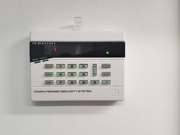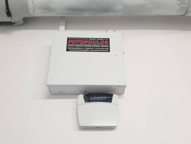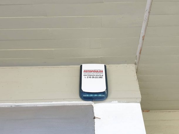 Τοποθέτηση συστήματος ασφαλείας με εσωτερικούς ανιχνευτές , ανιχνευτές θραύσης κρυστάλλων και εξωτερική δέσμη εισόδου σε αποθήκη.